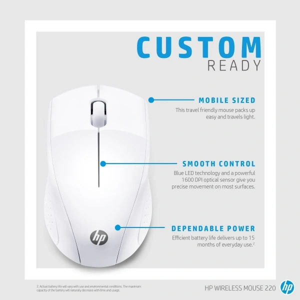 The HP 220 Snow White mouse has efficient battery life delivers up to 15 months of everyday use.