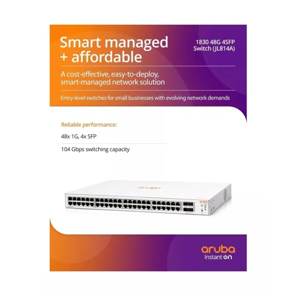 Differentiator: Entry-level, smart-managed, Gigabit Layer 2 switches. Easy-to-deploy, secure and affordable switches, designed for small businesses looking for cost-effective solution with evolving networking demands. Using the Instant On mobile app or the cloud-based web portal, quickly setup, monitor and manage the 1830 switches. Can also manage the device through the local web GUI. This model has 48 10/100/1000 RJ-45 and 4 SFP 1GbE ports.