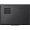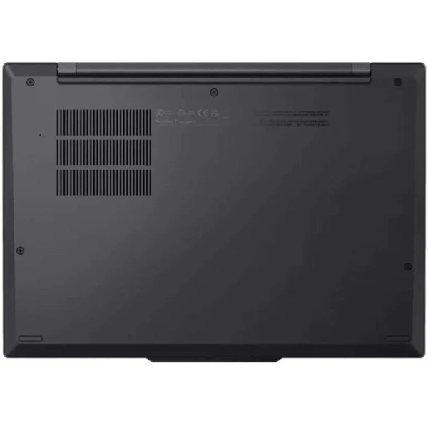 Cut-short, right side view of the Lenovo ThinkPad T14s Gen5 (14” Intel) Eclipse Black laptop suspended in air, focusing its right side ports, rear air vents, & aluminum-based bottom cover.